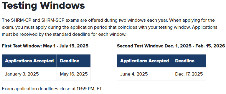 Visit the SHRM website for Exam Application, Costs & Deadlines.