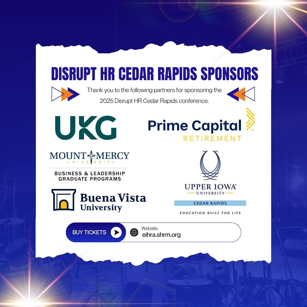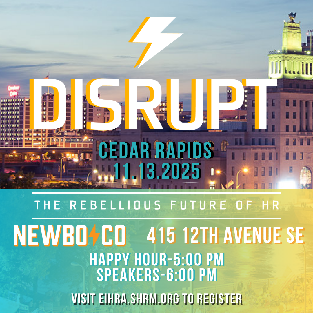 DISRUPT is an information exchange designed to energize, inform and empower people in the HR field. Join Eastern Iowa SHRM and other HR Professional's for this fantastic event with great food, great drinks and great ideas!