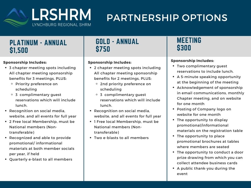 Lynchburg Regional SHRM holds membership meetings on the second Thursday of each month from 11:00 am to 1:00 pm. Please complete the Sponsorship Application/Agreement to become a sponsor and contact a member of the Lynchburg Regional SHRM Board of Directors with any questions regarding sponsorship.